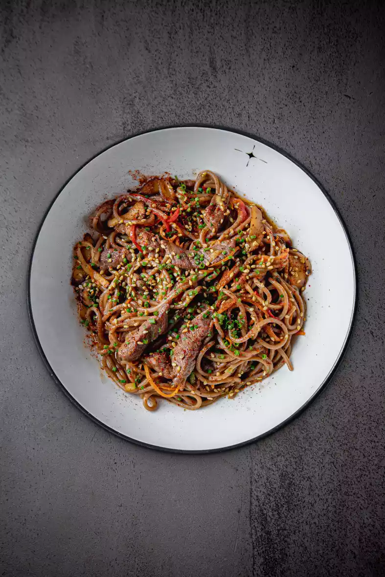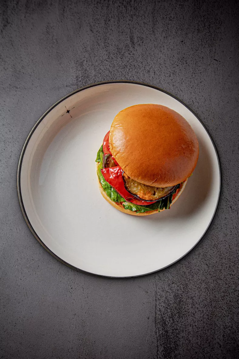 Цыплёнок с соусом наршараб, спелые томаты, ялтинский лук и свежая зелень