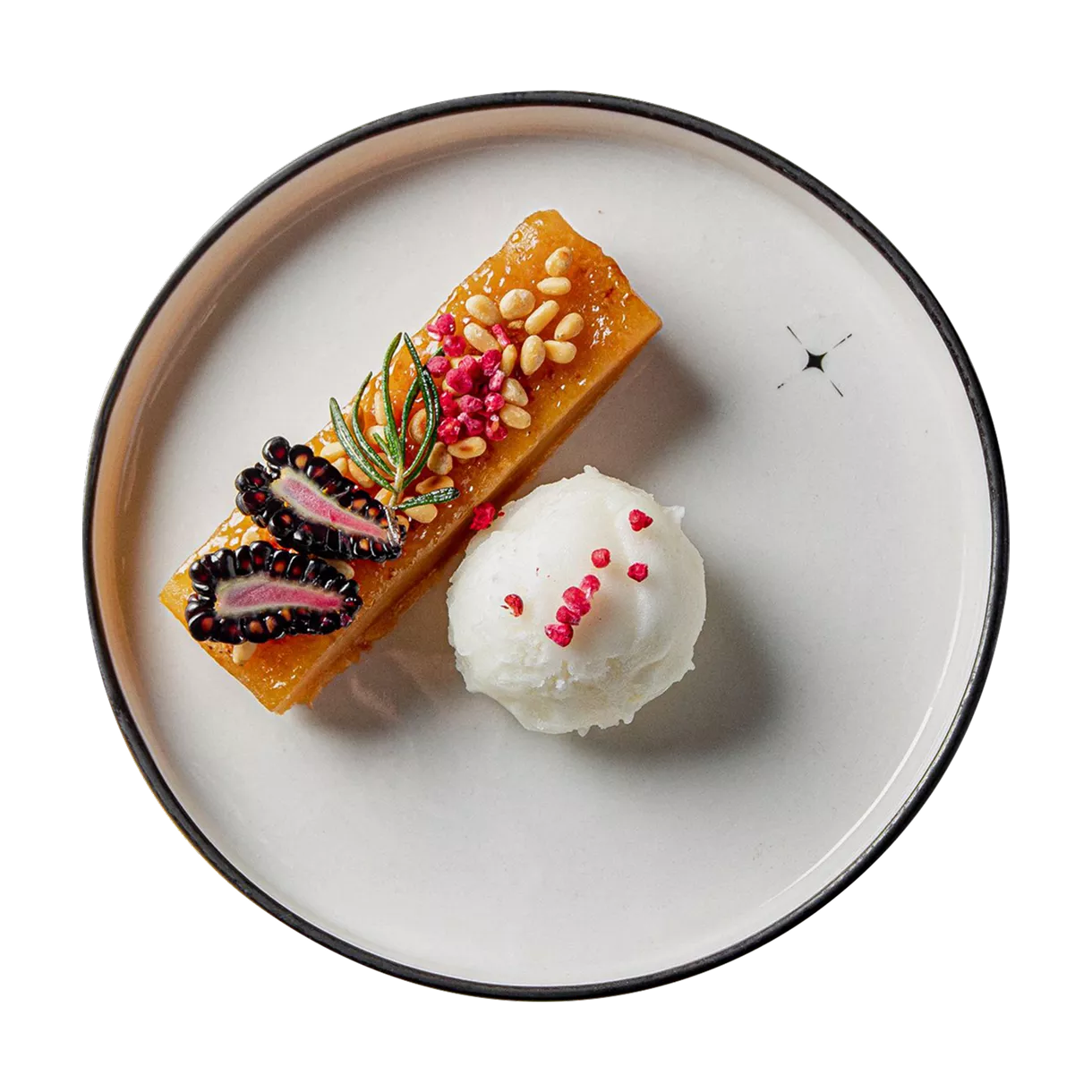 Яблоко, орех кедровый, тростниковый сахар, постное сливочное масло, розмарин, сорбет юдзу.