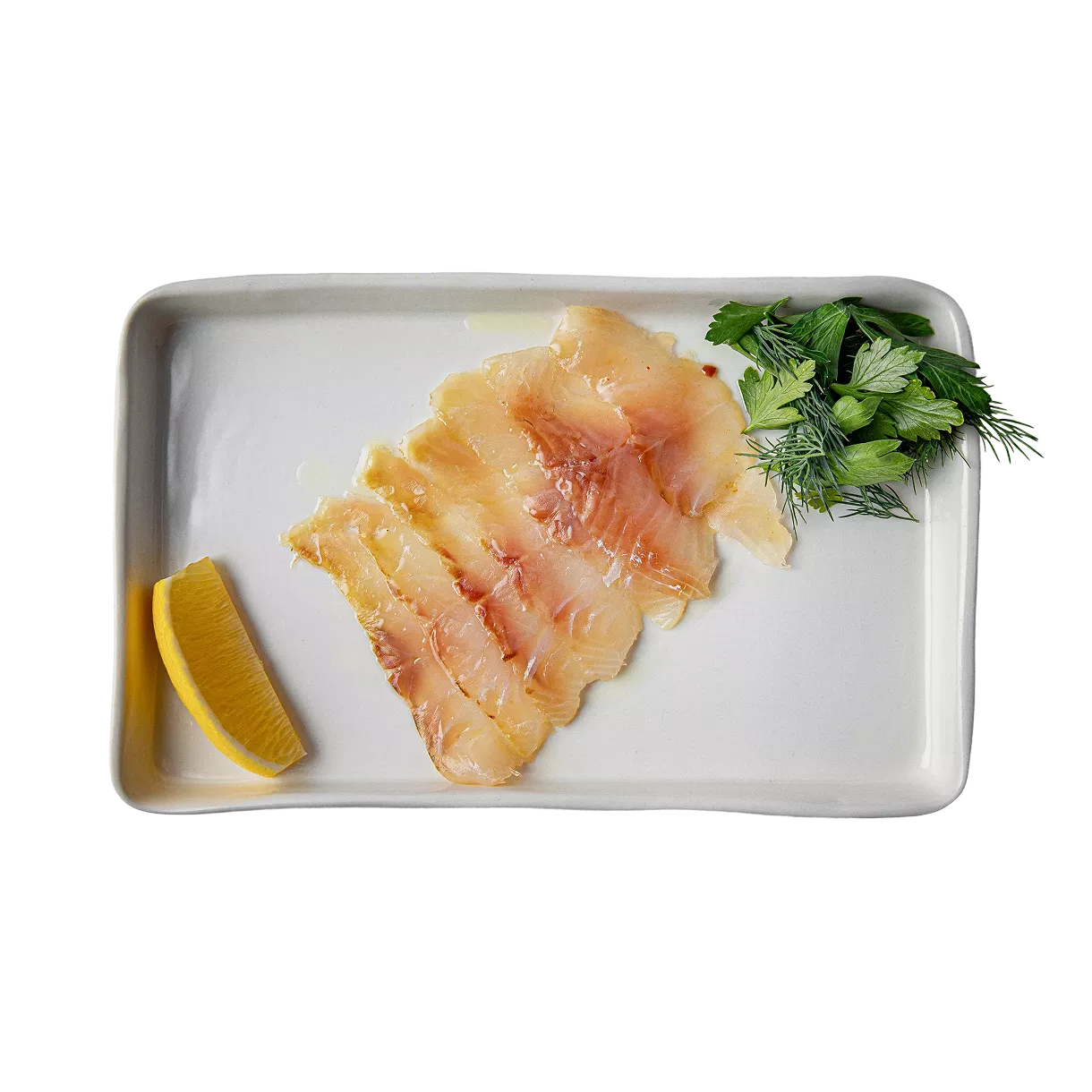 Омуль слабосолёный филе, лимонное масло, укроп, листья петрушки, лимон.