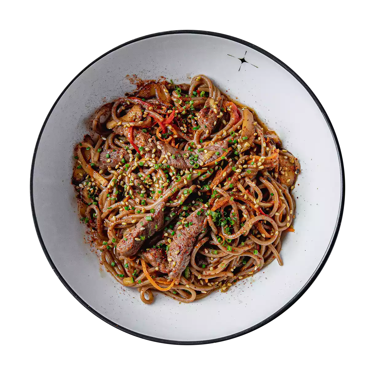 Нежная гречневая лапша Соба с сочной говядиной и хрустящими овощами обжарена до золотистой корочки. Острые нотки шичими и пикантный кунжут васаби создают яркий, многослойный вкус, который оставляет насыщенное послевкусие.
