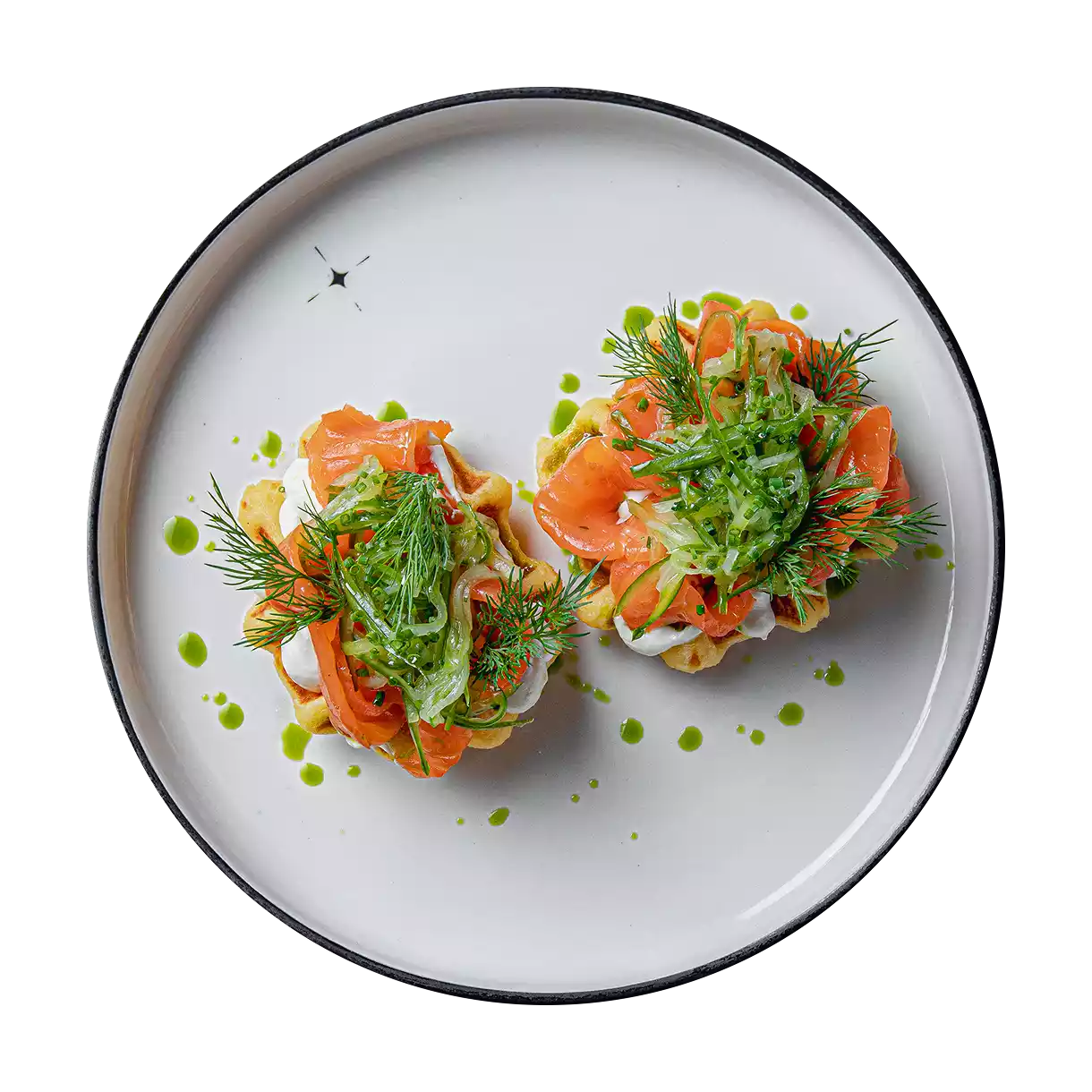 Хрустящая картофельная вафля с нежным слабосолёным лососем и кремовым соусом из хрена. Цедра лимона и свежий укроп придают свежесть, а крем-чиз создаёт мягкий сливочный акцент.