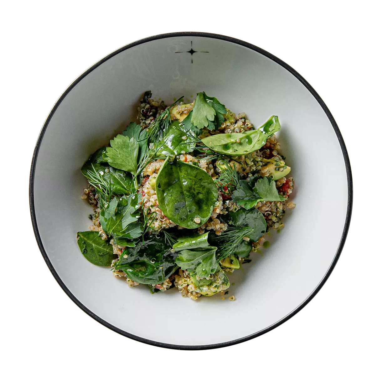 Киноа, авокадо, шпинат мини, томаты конкасе, листья кинзы и петрушки, укроп, фреш лайма, укропное масло, оливковое масло.