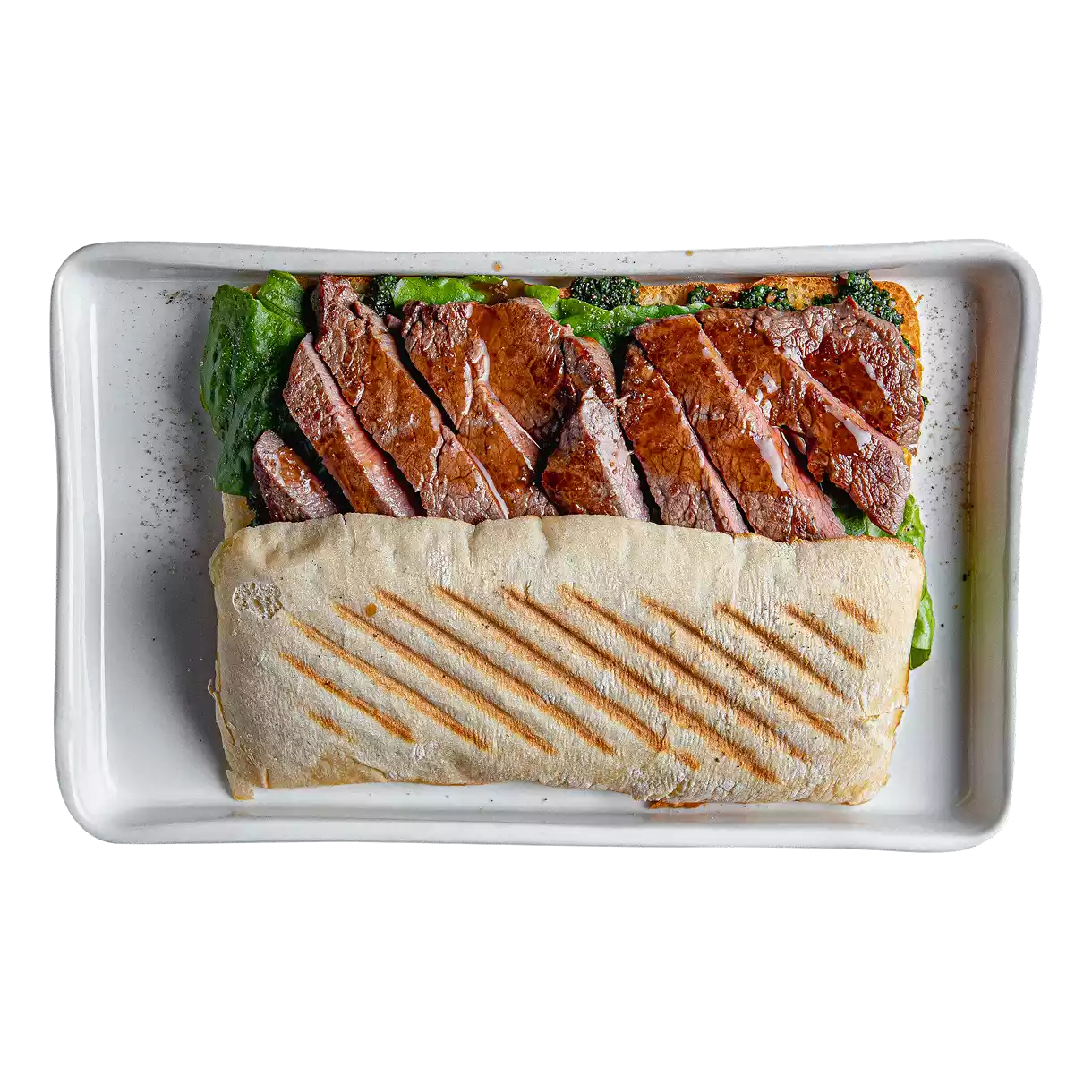 Сочный стейк миньон в нежной булочке панини с ароматным соусом чимичурри и бархатным цитрусовым демигласом. Листья романо добавляют свежесть и лёгкий хруст, создавая идеальный баланс вкусов.