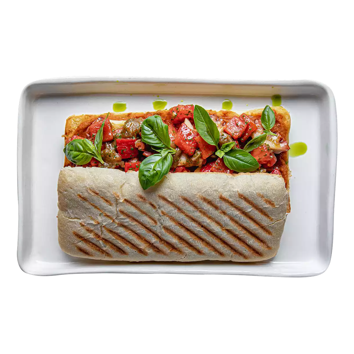 Нежный мусс из баклажанов, спелые томаты, итальянские гренки