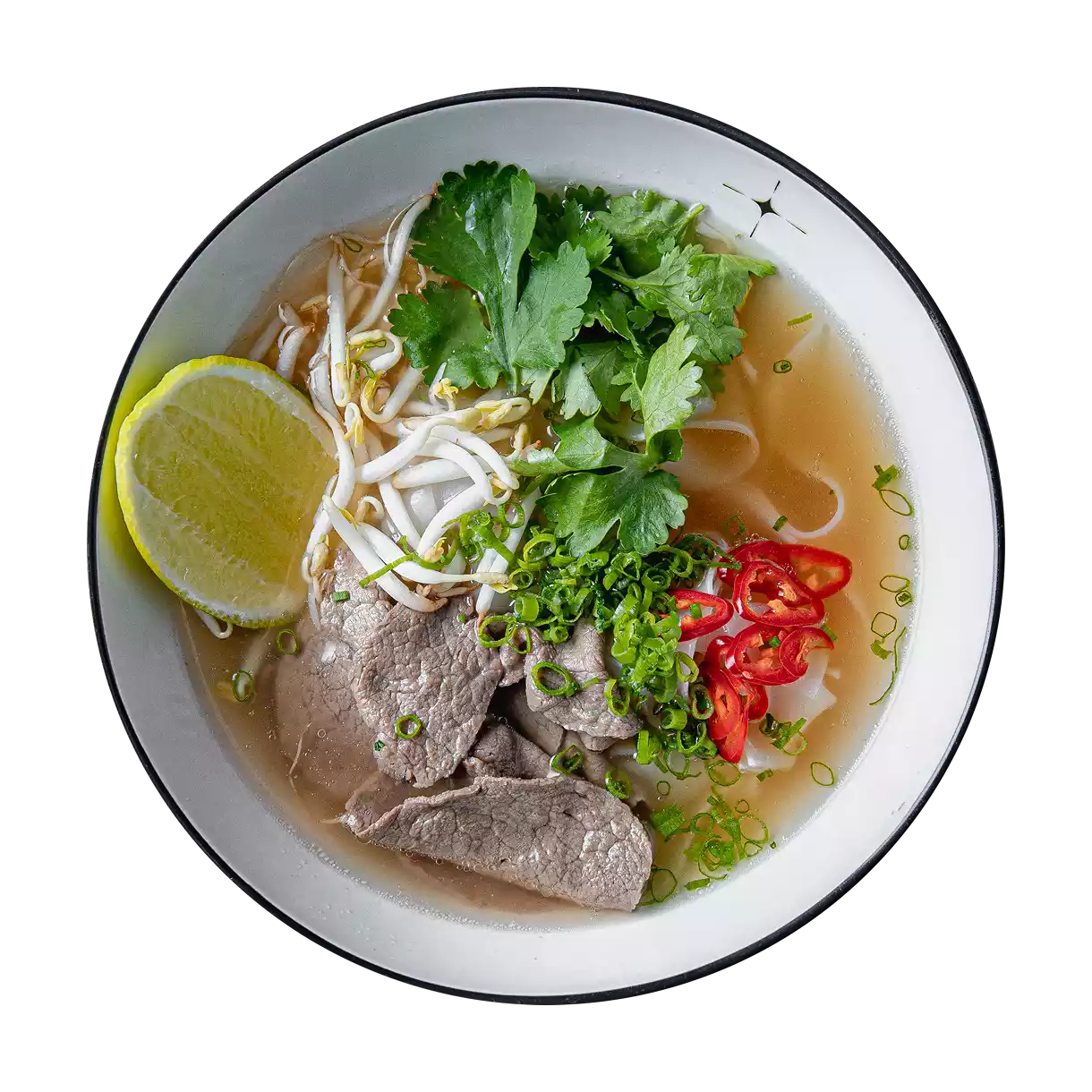Классический вьетнамский суп Pho Bo с прозрачным ароматным бульоном, нежной говядиной и фунчезой. Свежие травы и ростки бобов придают лёгкость и яркий вкус, а чили добавляет лёгкую пикантность.
