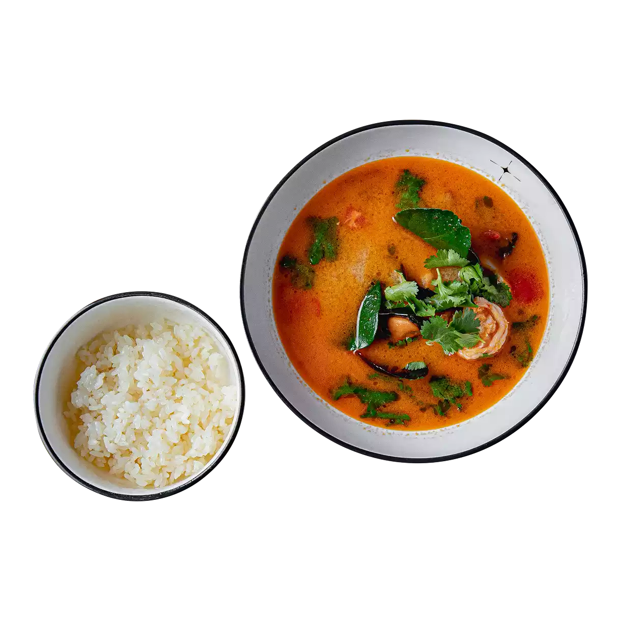 Креветочный бульон, паста том-ям, кокосовое молоко, масло сливочное, сладкие томаты, креветки, мидии, филе кальмара, листья лайма, шампиньоны, кинза, японский рис.