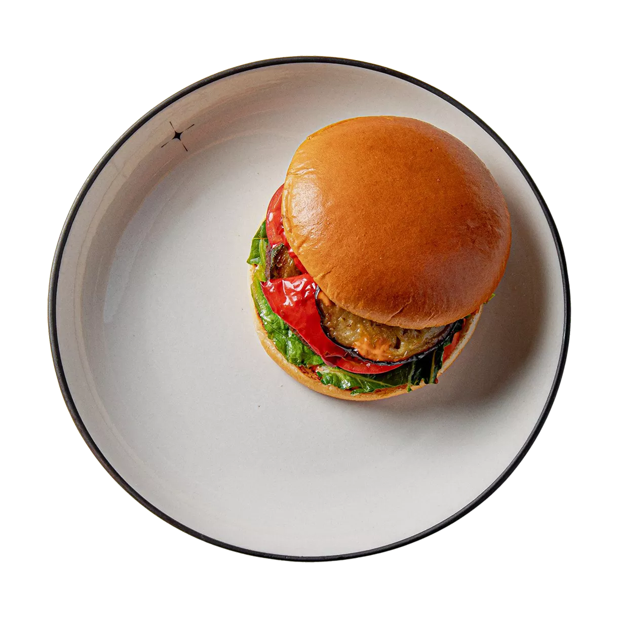 Растительная котлета и овощи гриль в мягкой картофельной булочке. Сытно, насыщенно — идеальный вариант классического стрит-фуда, но без чувства вины.